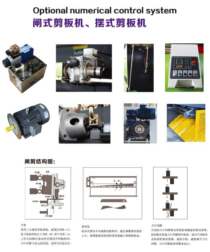剪板機系統(tǒng)采用三點滾輪導(dǎo)軌結(jié)構(gòu),前預(yù)壓導(dǎo)軌(C)使刀架始終貼在上導(dǎo)軌(B)和下導(dǎo)軌(A)上作無間隙往復(fù)動作在剪切不同板料時,刀片間隙可做無縫調(diào)整,使剪切質(zhì)量更好。